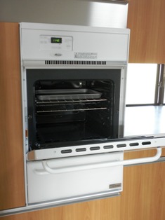 | 施工後: 製品 Amana(アメリカ製) ガスウォールオーブン CWG3100(ホワイト) 上段の大型オーブンは庫内灯をつけるとドアを開けずに焼き具合を確認できる。 下段は温度設定可能な大型ブロイラー |